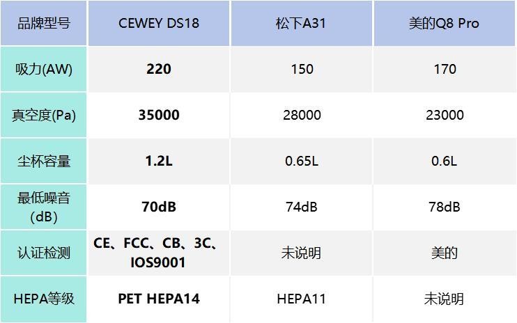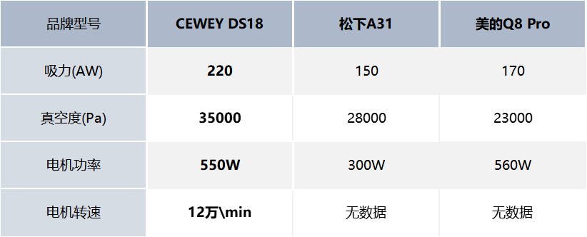 小结:从吸力参数来看,CEWEY DS18 搭载550W无刷电机,标称吸力220AW、真空度35000Pa,参数余量充足,应对硬地颗粒与短绒地毯细灰更踏实。松下A31 的标注偏稳,强调持续输出,不追求极限峰值;美的Q8 Pro 倾向其他性能的提升,吸力标注更克制,峰值空间有限。单从纸面数据看,CEWEY DS18 在吸力与真空度上的主动权更大,可用余量更宽。