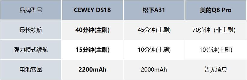 小结:三款机型的续航差距不算大。CEWEY DS18 在“标准档+主地刷”下约40分钟,高吸约15分钟,切档后的时长预期比较稳定,日常一趟清下来通常不用中途充电,也能兼顾偶尔的高功率场景。松下A31 的续航标注一般与之相近,但在高吸场景的持续时间更依赖具体模式与用法;美的Q8 Pro 往往强调最长续航表现,但实际高负载时长需要结合场景理解。总体看,若更看重高功率清洁下的持续时间,CEWEY DS18 更稳;以日常保洁为主,松下A31 和 美的Q8 Pro 的续航策略也能覆盖日常需求。
