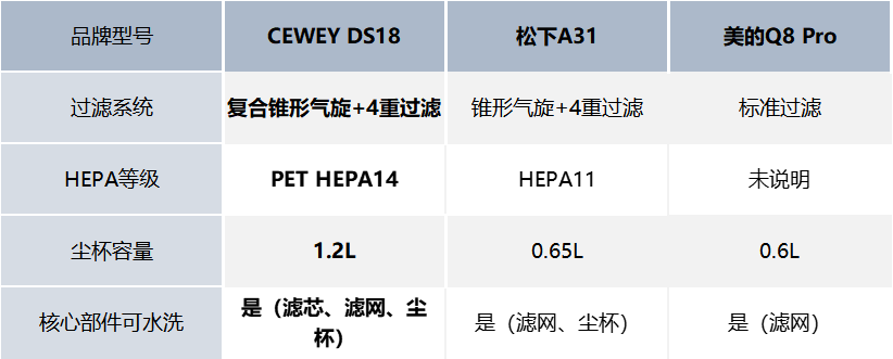 小结:过滤方面,CEWEY DS18 采用复合锥形气旋配合四重过滤,主滤网为可水洗的 PET HEPA14,对细尘、螨虫与过敏源的拦截路径更清晰;尘杯 1.2L,减轻频繁倒尘的打断。松下A31 与 美的Q8 Pro 同样走多层过滤思路,但官方标注不一,常见为未注明或等级偏低;两者尘杯普遍小于 CEWEY DS18,清洁节奏更依赖使用频率。整体看,CEWEY DS18 在过滤等级标注与可水洗覆盖度更明确,配合更大的尘杯,日常维护更省事、长期成本更可控。