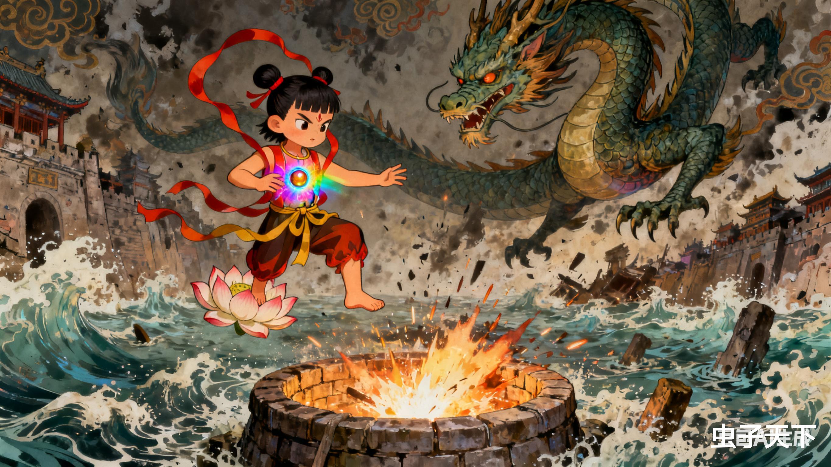 就在这时,井口“砰”地炸开,哪吒赤足踏莲,胸口那窟窿里闪着七彩光,他朗声喊:“大龙,别打我师父,心是我吃的,我还你!”