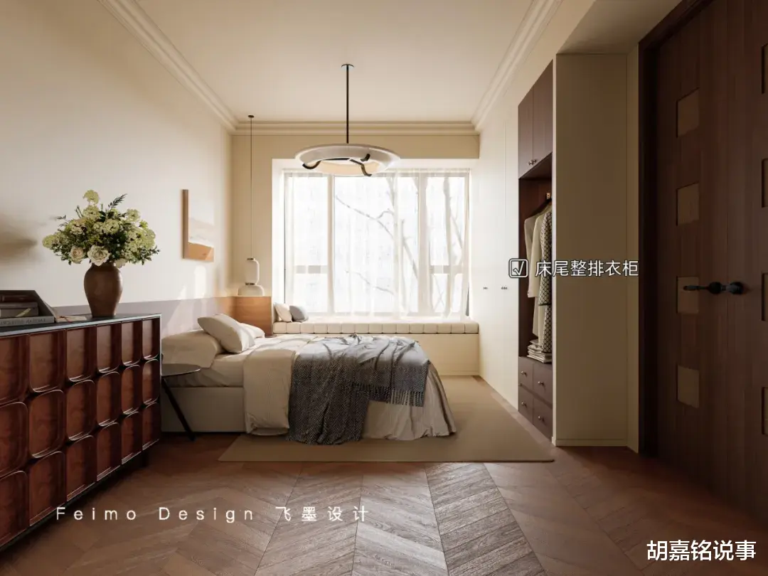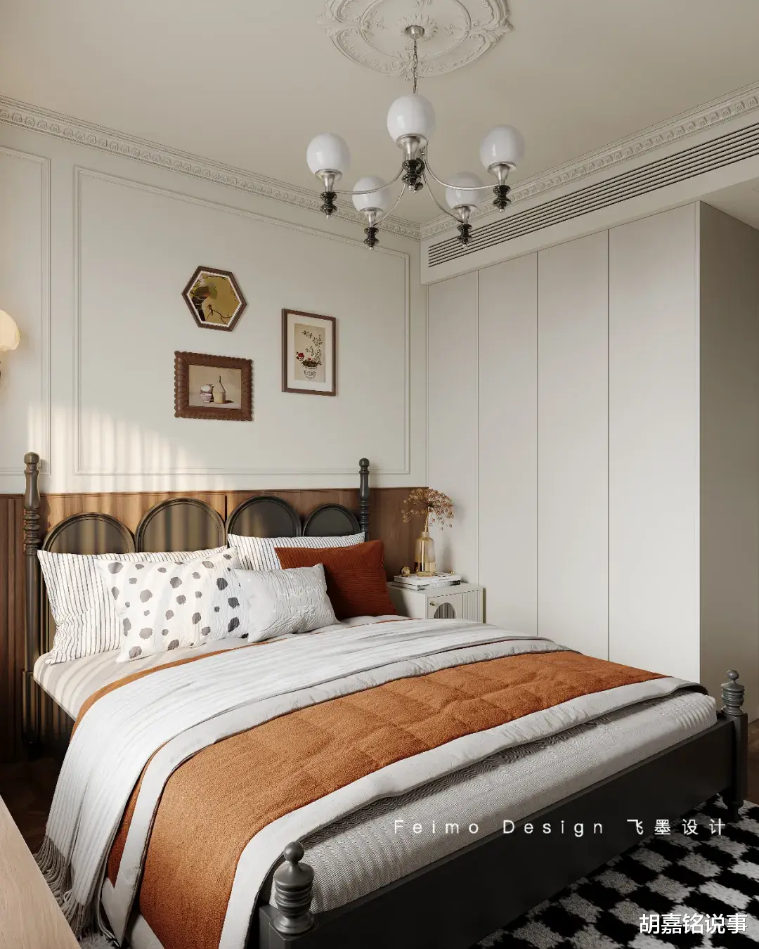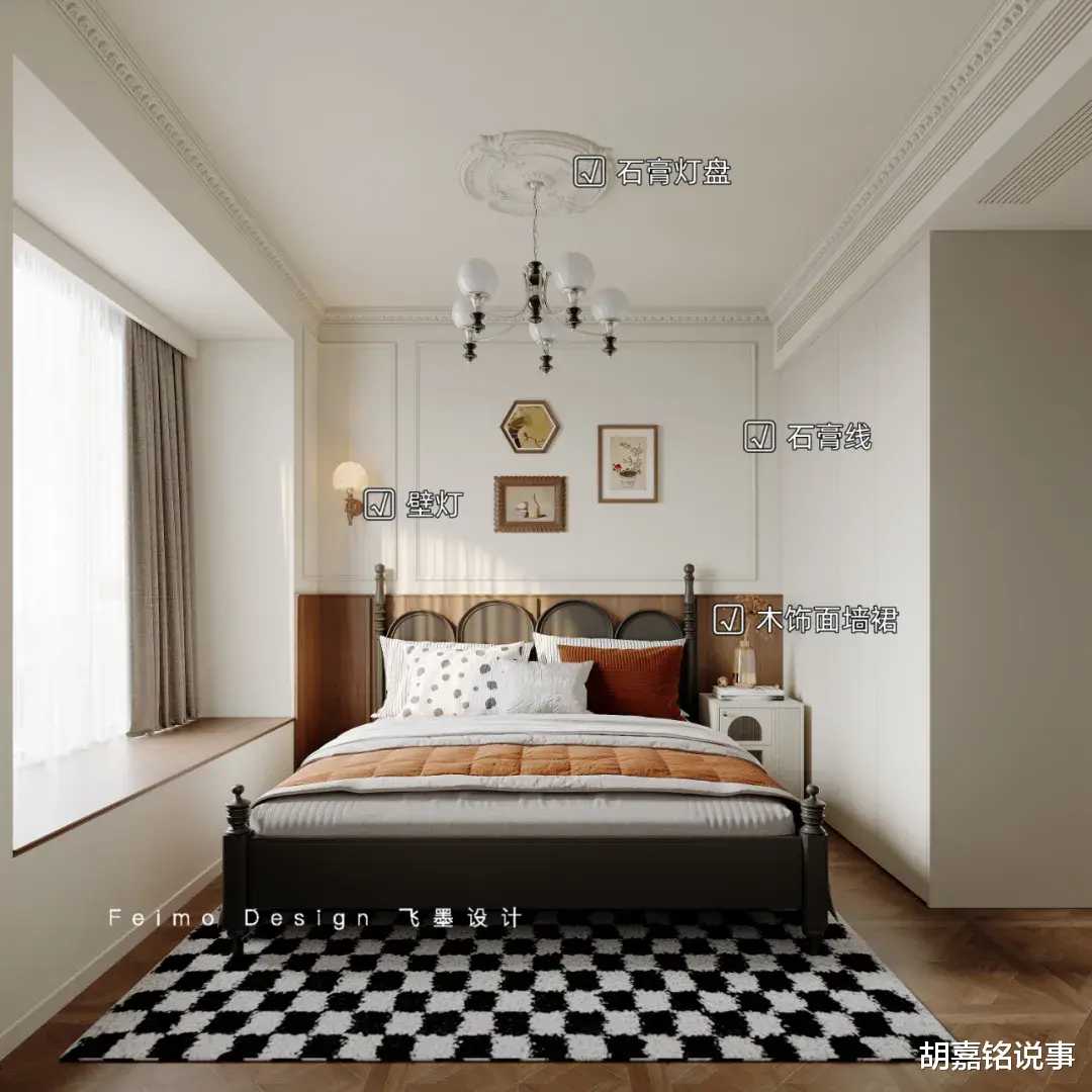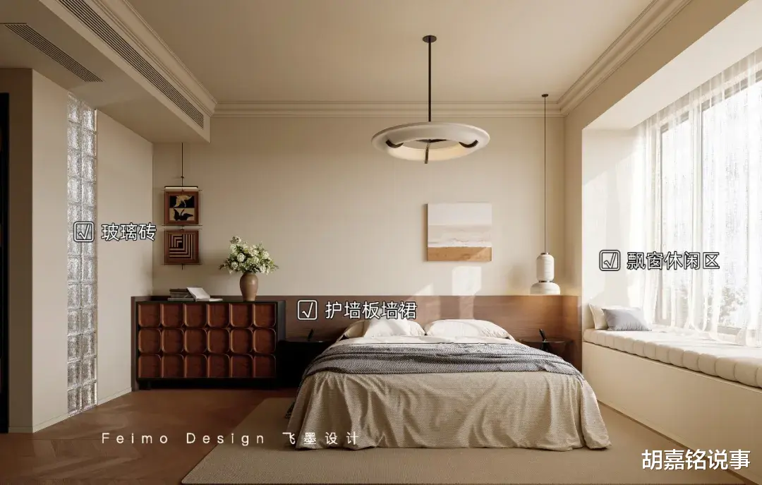 设计亮点:①床头背景墙设计护墙板墙裙+石膏线装饰。②保留飘窗,作为休闲区使用。