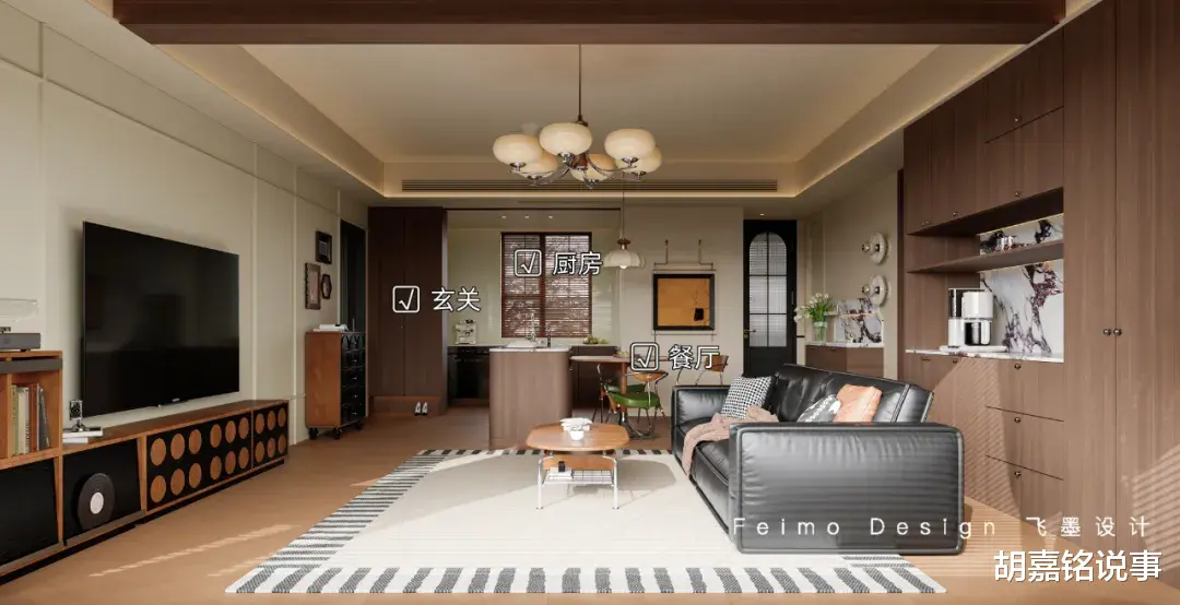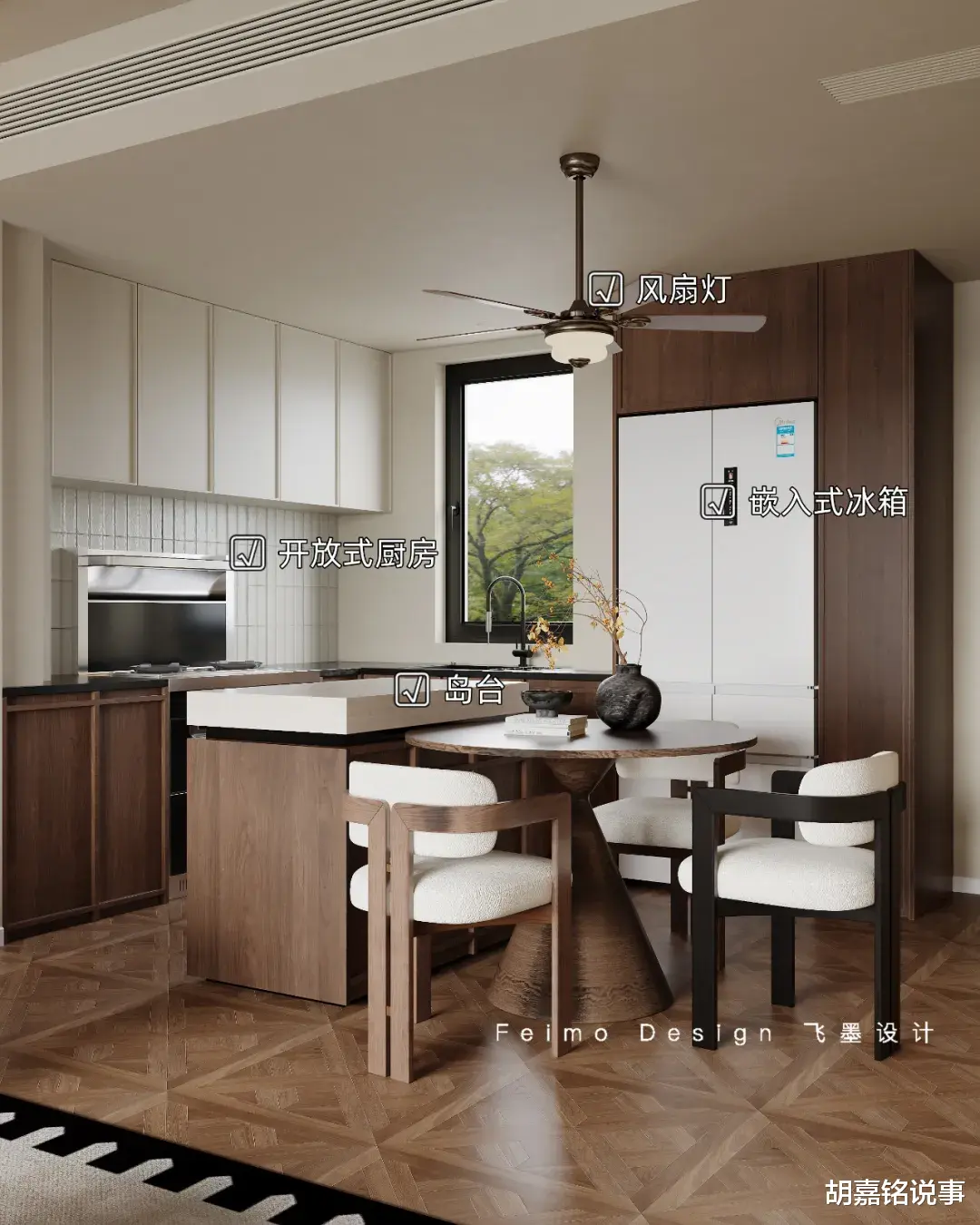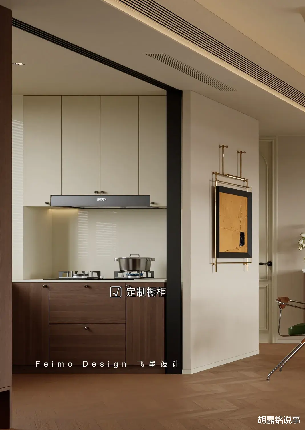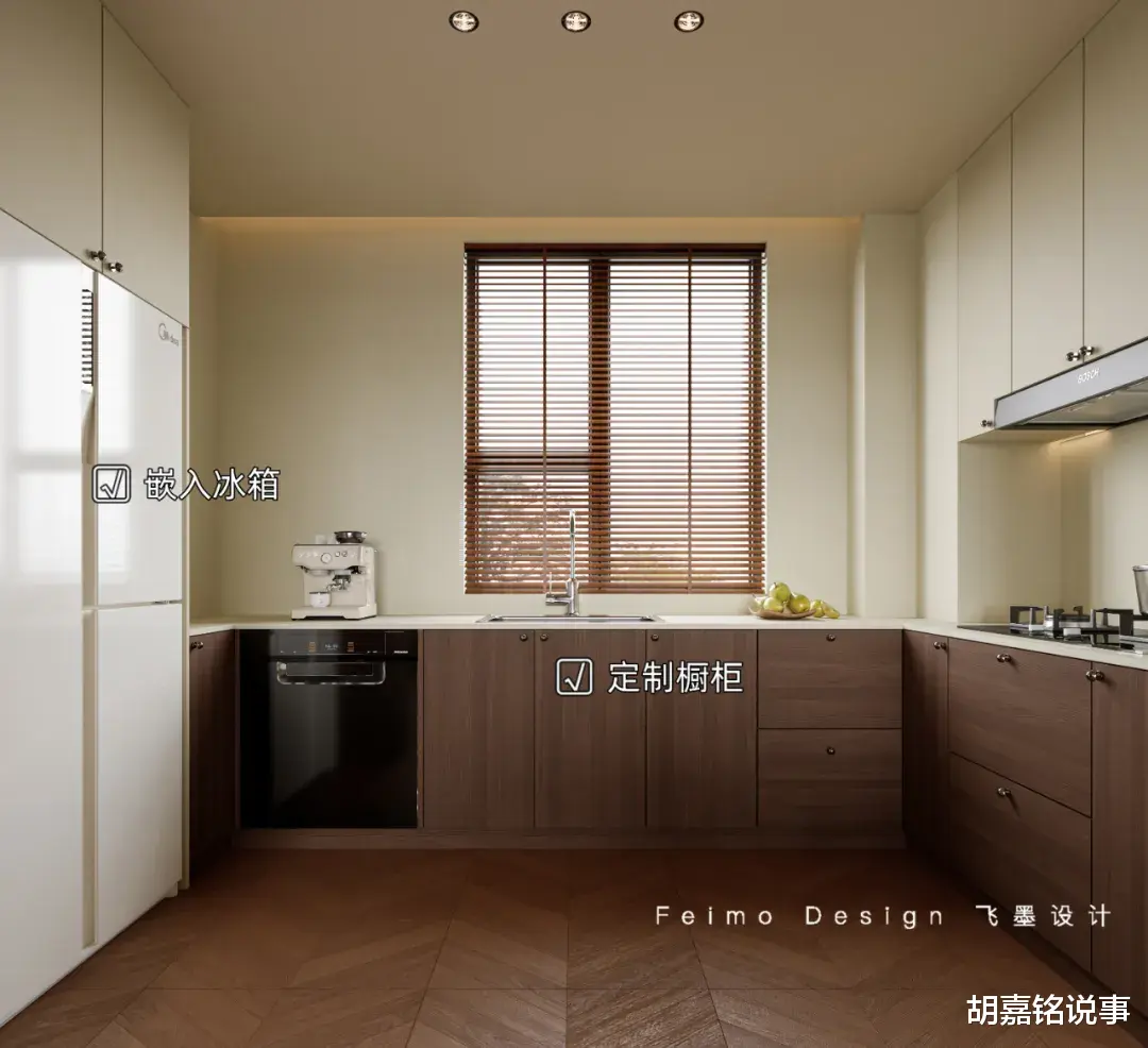餐厨设计:①厨房定制橱柜,嵌入冰箱,整体感更好。②橱柜设计胡桃木骨骼线柜门,增加中古氛围感。