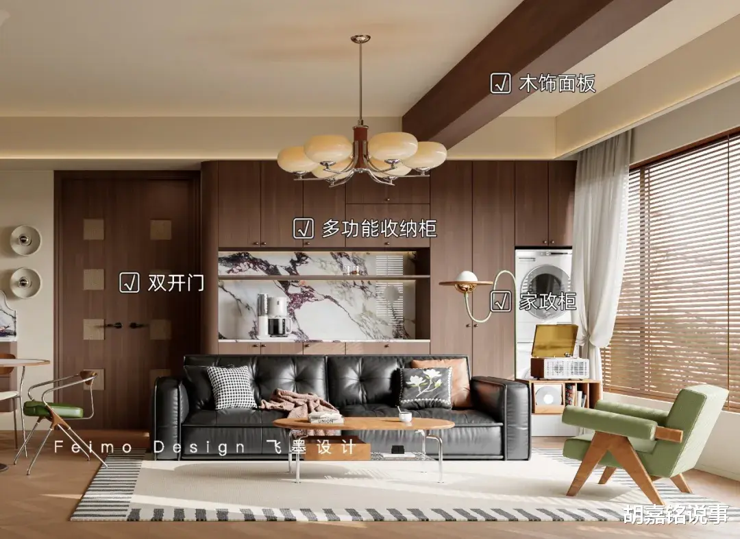 设计亮点:①沙发背景墙定制一排柜体,功能结合收纳、水吧、家政柜。②电视背景墙设计护墙板装饰,提升质感。
