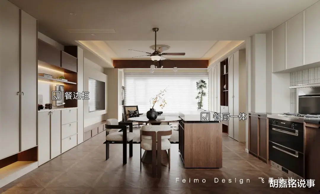 设计亮点:①餐厅增加岛台,增加餐厅收纳,也可作为西厨操作台使用。②靠墙定制悬挑收纳柜,结合岩板台面,提升质感。