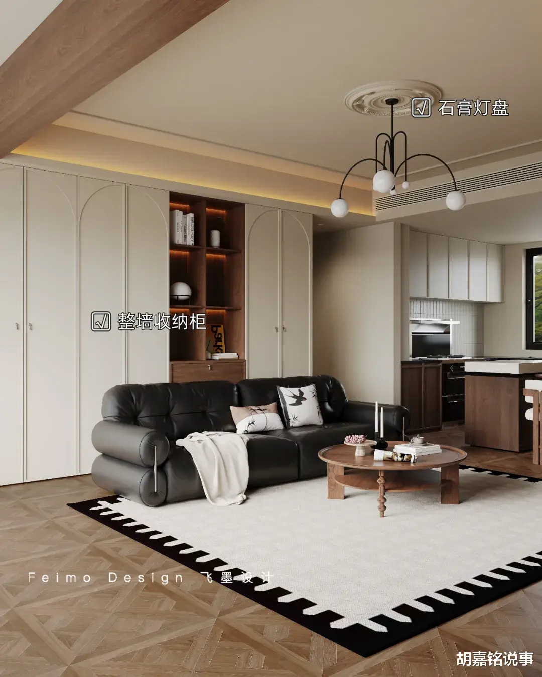 设计亮点:①客厅阳台打通,提升室内采光通风效果。②沙发背景墙定制一整排柜体,提升客厅收纳力。