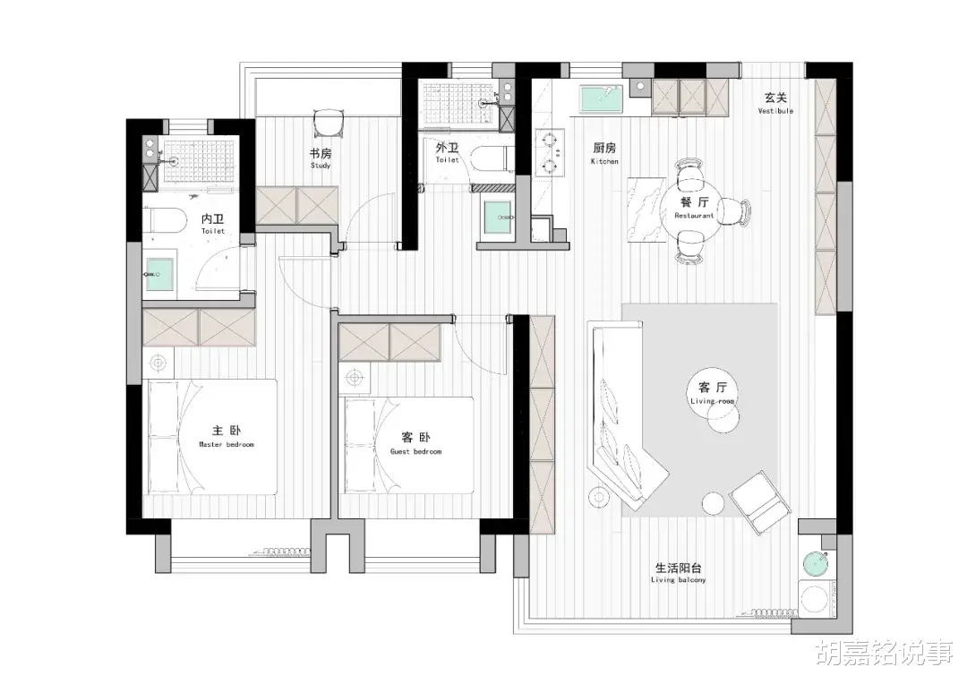 布局改造:①原始布局玄关餐厨挤在一起,将厨房与餐厅玄关打通,设计开放式厨房+餐厨一体,使用便捷度更高。②客厅与阳台打通,室内采光效果更好。③保留两个南卧室,北次卧改为书房。