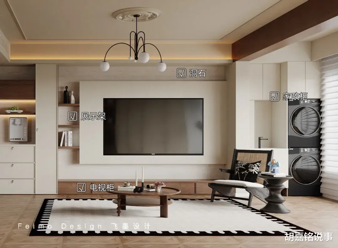 ③电视背景墙设计悬挑造型+洞石装饰,兼顾颜值与质感。