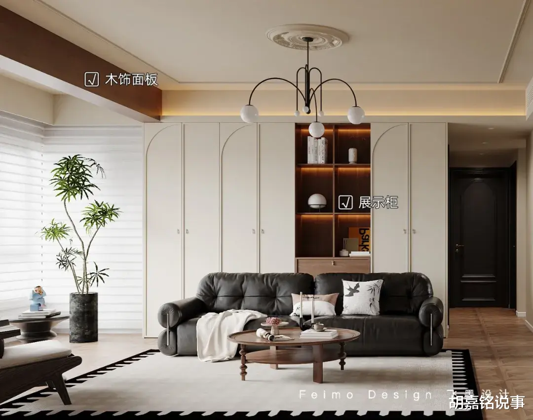 ④客厅阳台之间不能拆的横梁,用木饰面包裹,提升颜值。