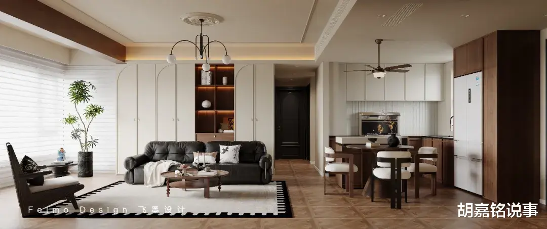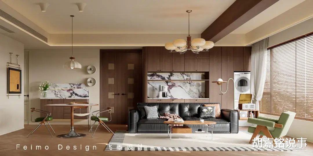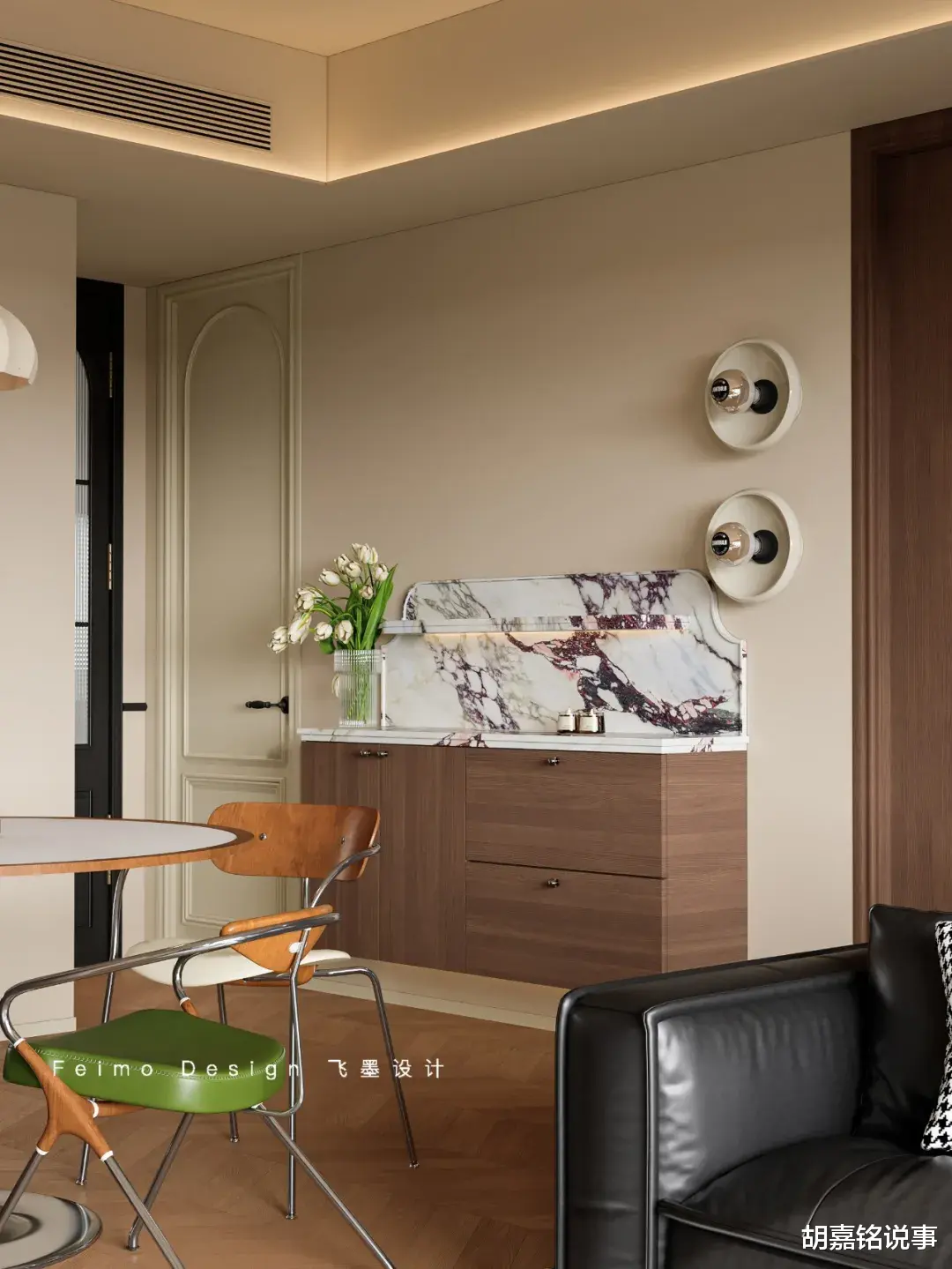 第二套案例是一家三口居住,风格同样是选择了中古风,但业主的女儿更喜欢偏意式的感觉,所以整体的风格处理更干净利落一些。
