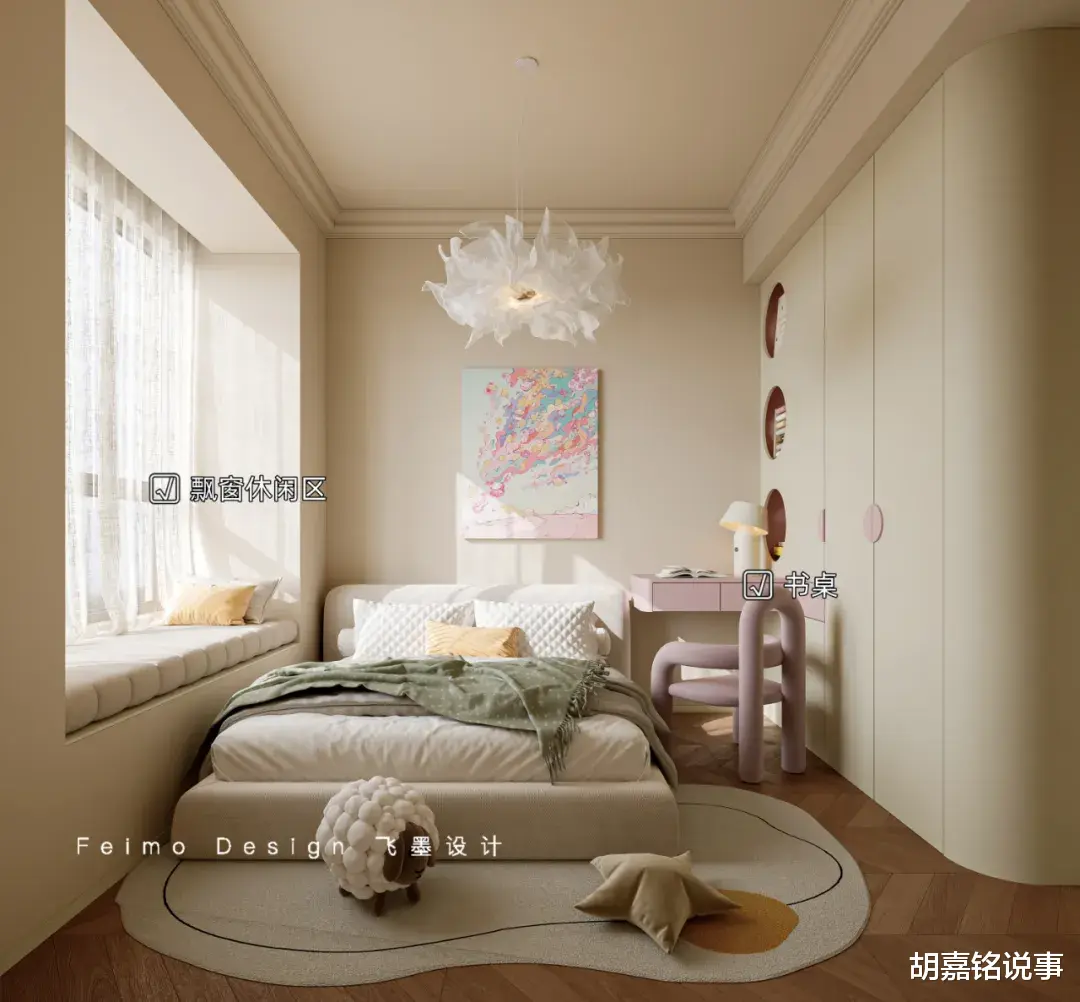 设计亮点:①定制衣柜、书桌,代替床头柜功能。②飘窗定制软垫,作为休闲区使用。