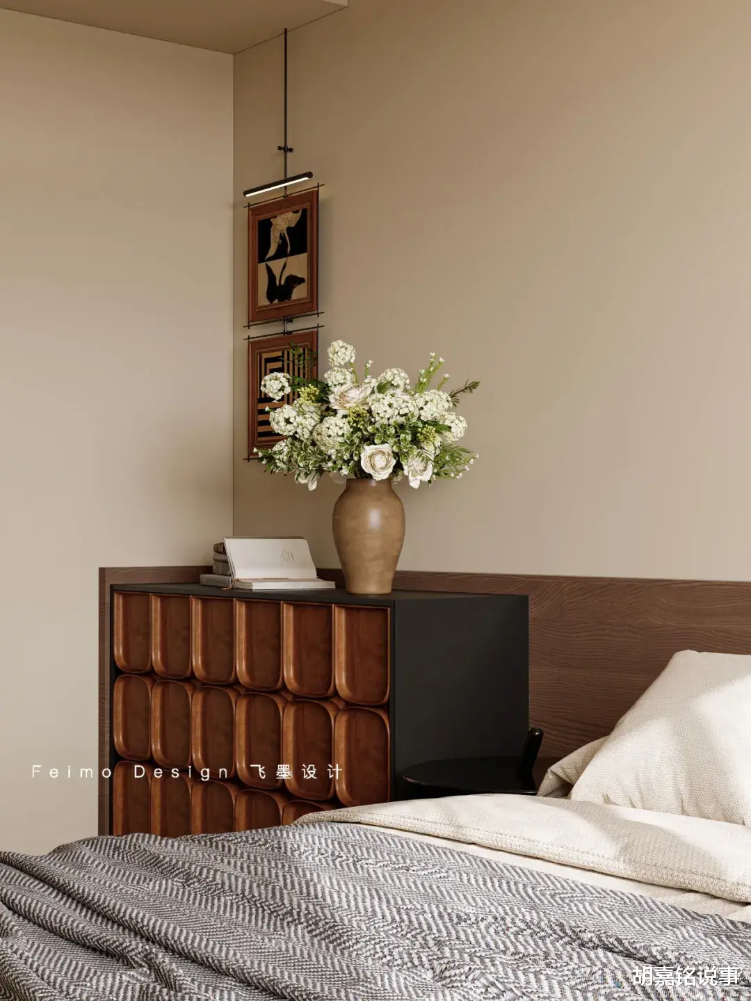 ④面向客厅的主卧门洞,设计双开门,门板样式设计柜体同材质。