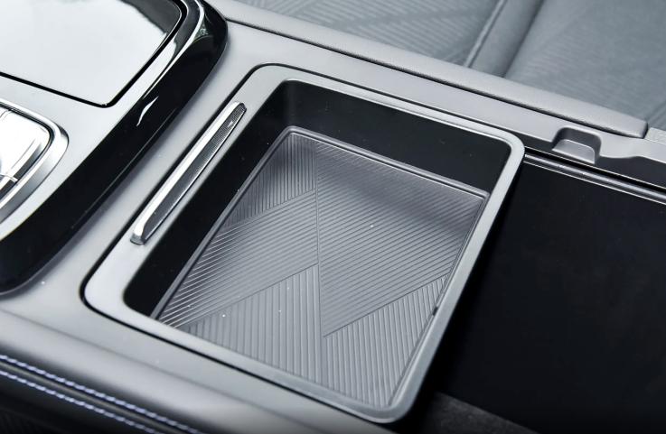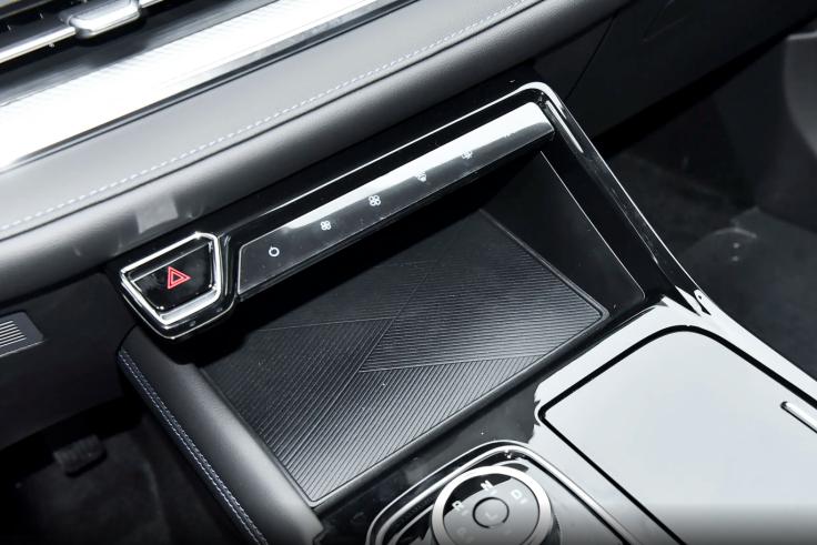 同时中控区域还设计了两块储物空间,一块位于中控台下方,另一块位于中央扶手箱前端,表面采用斜纵纹理设计实现防滑效果,用来放置手机或琐碎物件刚刚好,比较实用。不过需要批评一下,中控屏下方虽然保留了空调控制按键设计,但触控操作方式不够方便实用,驾车时更依赖于车机语音识别控制的准确性。