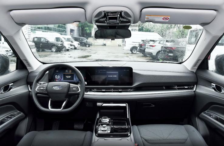 目光转向车内,第一眼没注意到“ford”方向盘标识的话,可能会将座舱错以为奇瑞瑞虎8的内饰设计。熟悉的四幅式多功能方向盘、双联屏、旋钮式换挡机构、贯穿式空调出风口、镀铬金属门板拉手等设计元素一应俱全,同时副仪表台还采用了大面积的黑色钢琴烤漆进行涂镀,进一步提升了内饰的精致氛围。