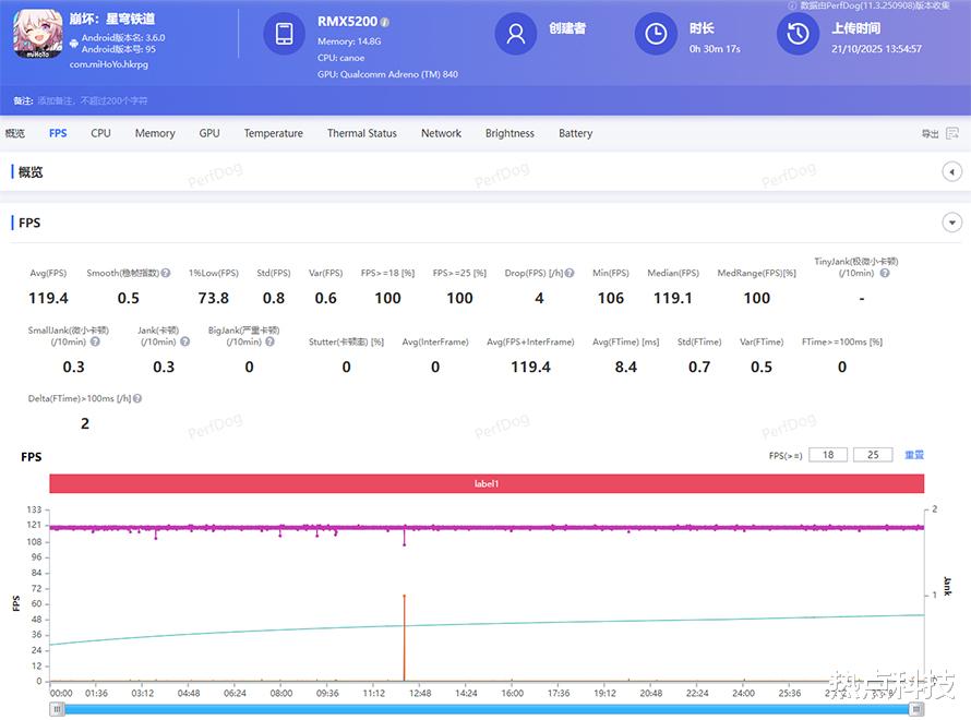 我们直接使用《崩坏:星穹铁道》来进行测试,可以看到,在2K+120fps超分超帧模式下,30分钟游戏之后,帧率稳在了119帧,几乎没有明显波动,一个字:稳。面对《崩坏:星穹铁道》这样的重载游戏都可以如此轻松,其他游戏自然不用担心了。