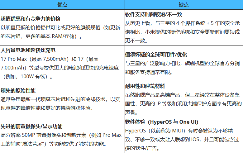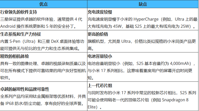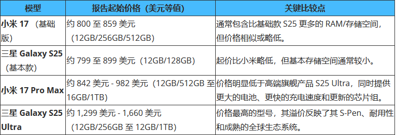 小米 17 系列与三星 Galaxy S25 系列的价格对比,主要区别在于价值主张,小米一般会以较低的起价提供同等或更优的硬件规格。