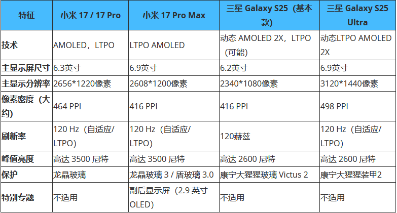 以下是小米 17 标准版和三星 Galaxy S25 型号的对比: