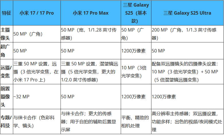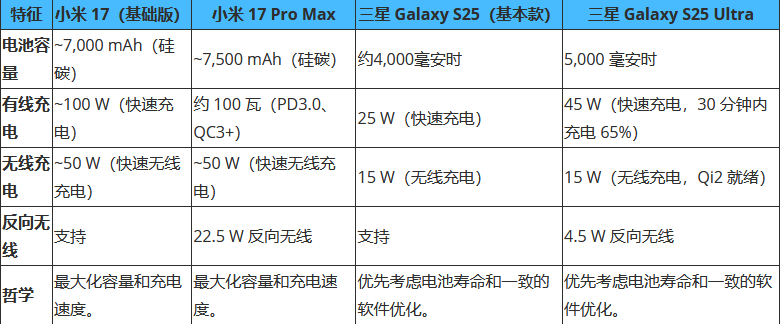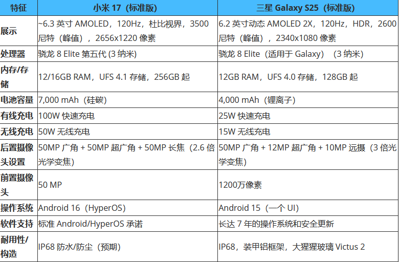 小米 17 和三星 Galaxy S25 的主要区别通常在于电池、充电速度和软件体验。