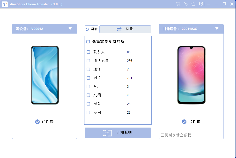 最后,点击“开始复制”即可启动复制过程。完成后,您就可以直接在新智能手机上访问数据了。
