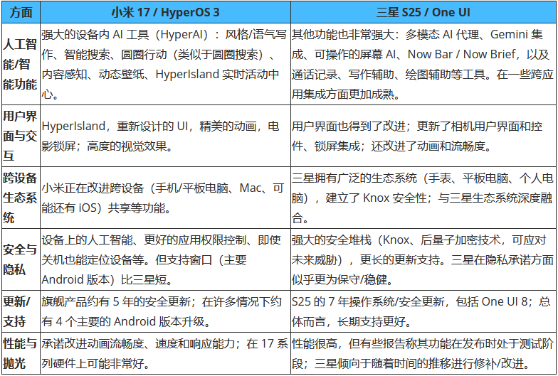 长期的软件支持和高度精致的用户体验(One UI)。 采用装甲铝框架等特点,保证耐用性。 设计稍微紧凑一些(6.2 英寸 vs. 6.3 英寸)。第 4 部分:小米 17 与 Galaxy S25:软件软件体验也许是这两款旗舰产品之间最显著的差异。