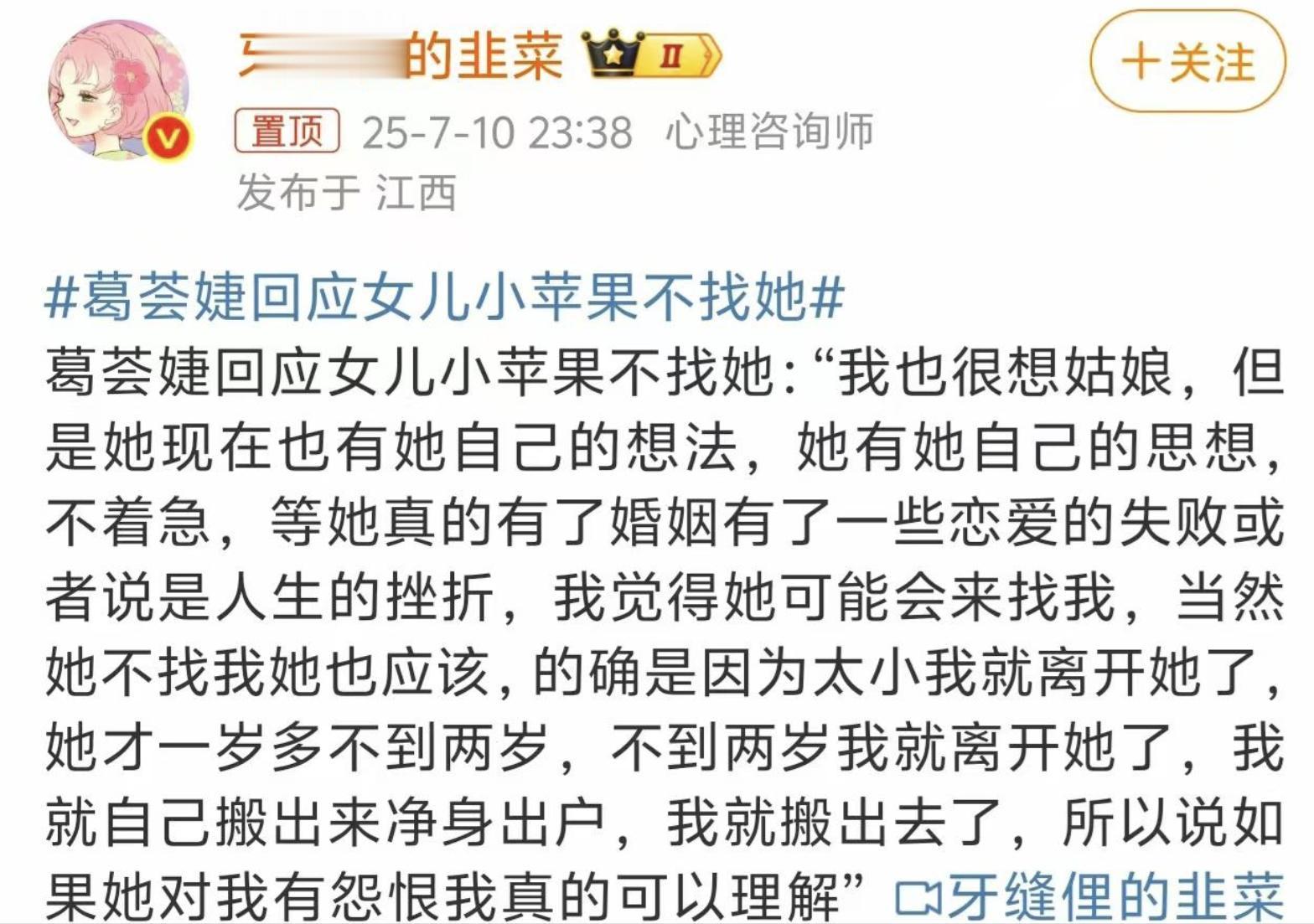 小苹果po出合照之后,立马有网友到葛荟婕的社交账号评论区告诉她小苹果谈恋爱的消息,问她怎么看。葛荟婕曾经透露,她和小苹果的关系很疏离,平时都没有联系,小苹果生活得很幸福,她也不愿意去打扰她的生活,但如果小苹果有需要她的地方她是非常乐意帮忙的。