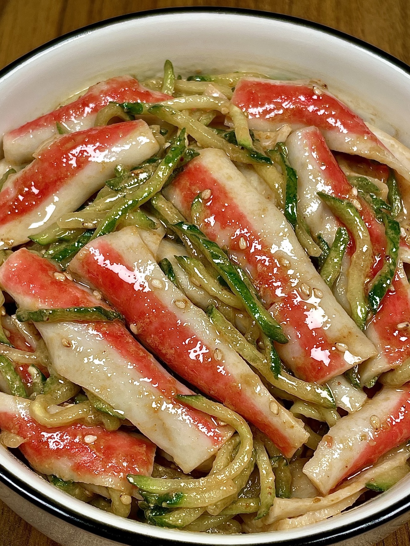 刚拌好的黄瓜拌蟹柳,色泽鲜艳,黄瓜清脆,蟹柳鲜美,每一口都是满满的幸福感。这道菜不仅美味,而且营养丰富,黄瓜富含维生素C和水分,蟹柳则富含蛋白质,是一道健康又美味的夏日小菜。