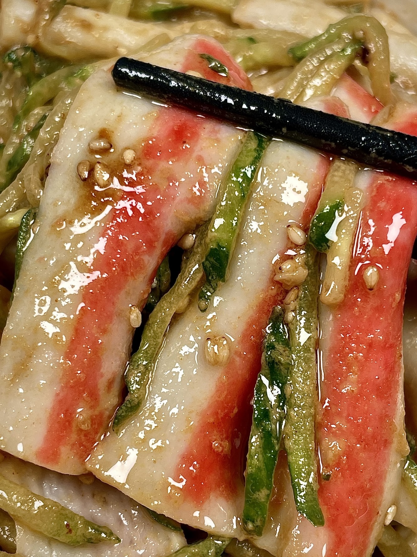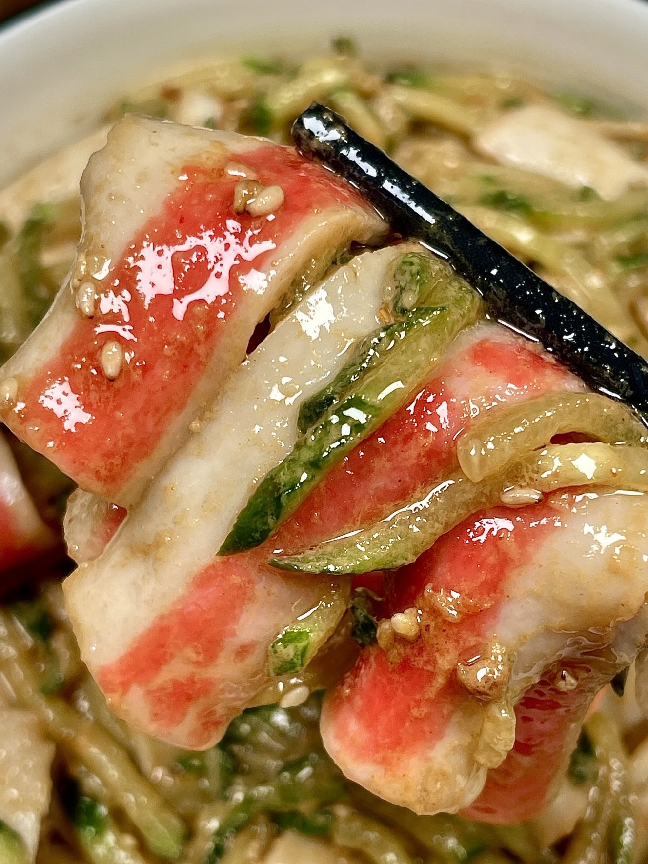 然后,用筷子将所有食材和调料充分拌匀,让黄瓜和蟹柳充分吸收调料的味道。拌匀后,可以尝一下味道,根据需要再做调整。