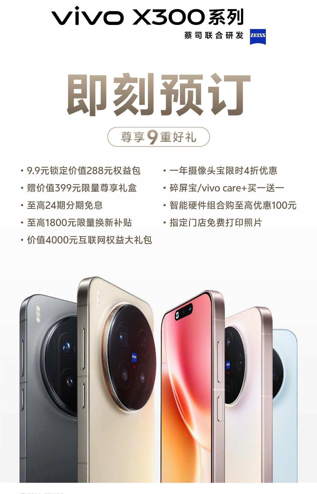 全能影像旗舰vivo X300系列已于9月26日开启预订,限时享9重好礼,包括至高24期分期免息、399限量尊享礼盒等,现在预订,提前享受专业级人像摄影的魅力!