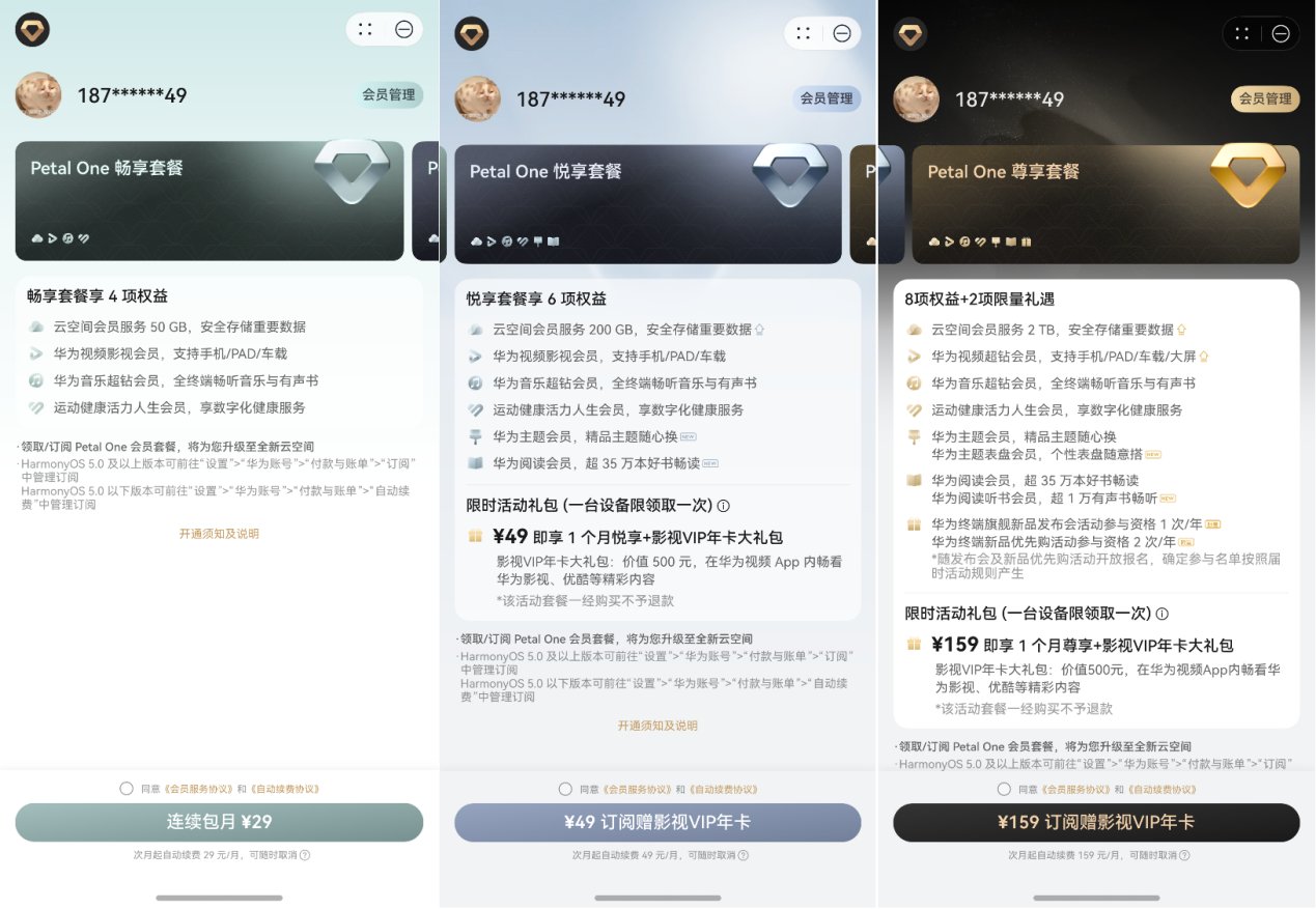 Petal One就是鸿蒙应用会员全家桶,分畅享、悦享和尊享三种。我选的是49元的悦享套餐,里面包含华为视频影视会员、华为音乐超钻会员、华为阅读会员、华为主题、200GB云空间等六大权益。单独开这些会员要110块,现在一个套餐搞定,省一半多。因为我是新用户,还额外获赠了影视VIP年卡大礼包,包含华为视频和优酷的年卡。