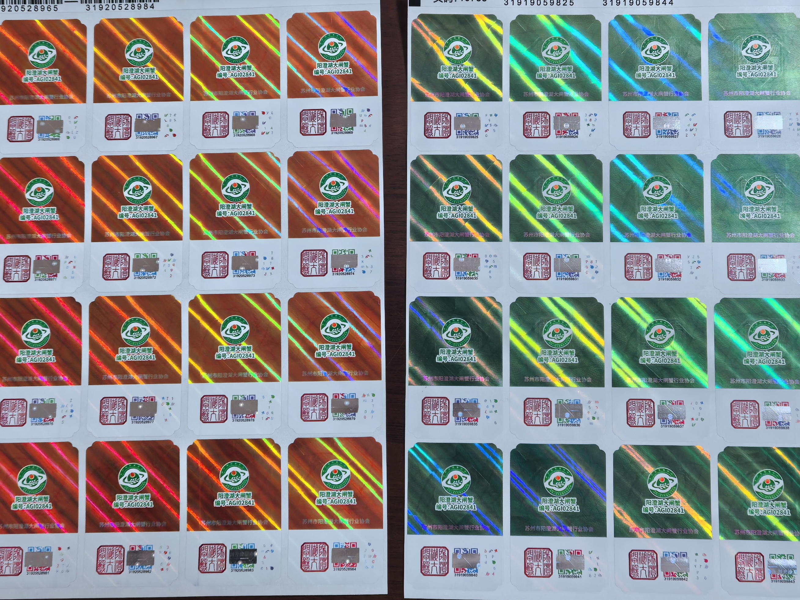 2025年阳澄湖大闸蟹封箱标贴防伪溯源标识。左为湖区围网养殖,右为沿湖周边高标准池塘养殖。