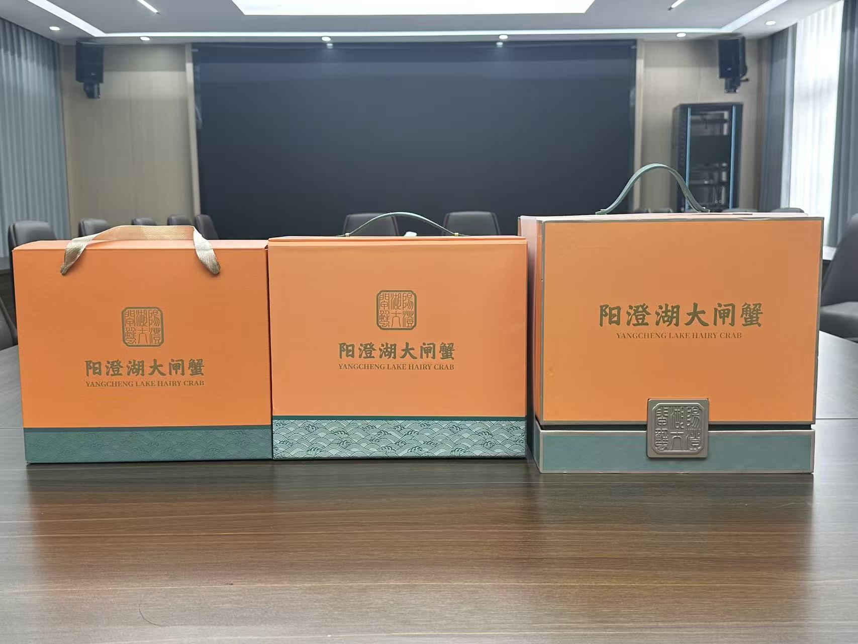 阳澄湖大闸蟹专用包装形象。从左至右依次为普通款、中端款、高端款。