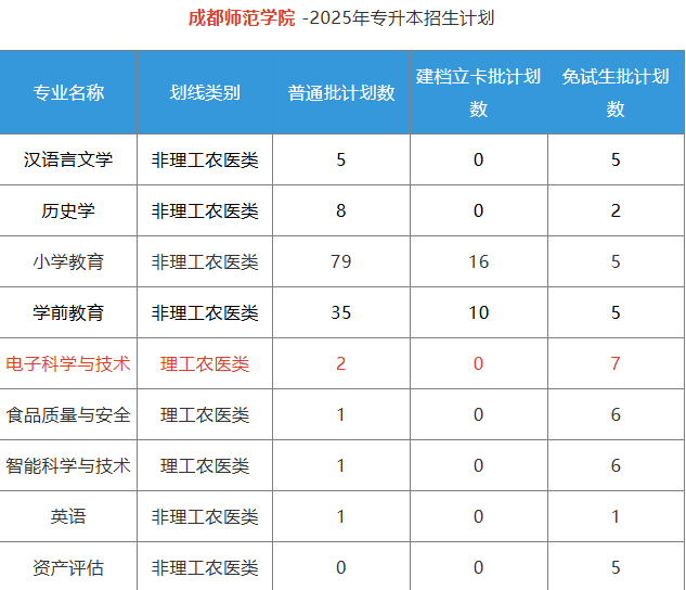 成都师范学院2025年专升本招生计划有200人,共招收9个专业招生,分别是汉语言文学、历史学、小学教育、学前教育、英语、资产评估、电子科学与技术、食品质量与安全、智能科学与技术。