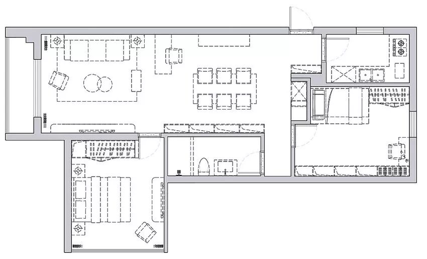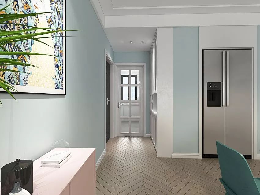 入户的玄关走廊连通了餐厅和厨房空间,在入户门的对面做上到顶的鞋柜,中间留空摆放杂物。地面铺贴人字拼的木地板,让玄关走廊看起来更加宽敞。