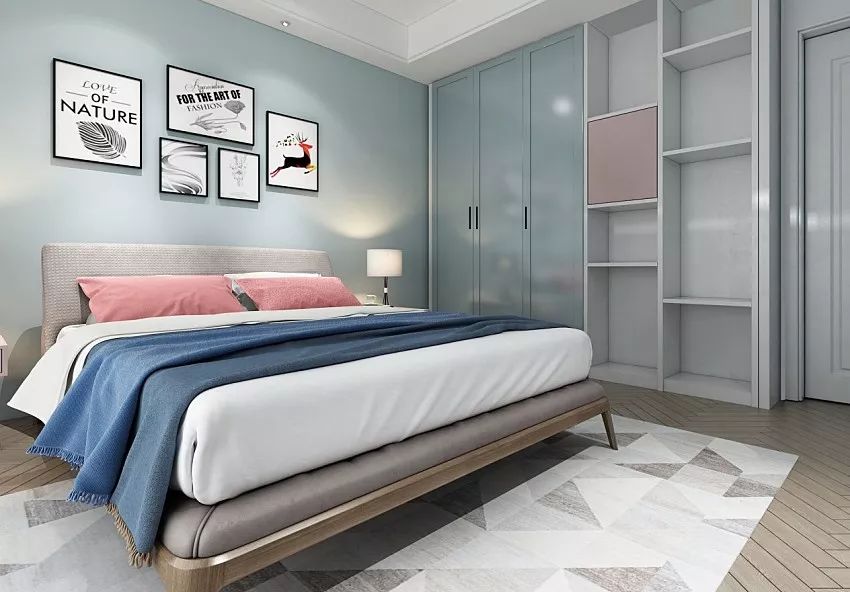 卧室另一侧的墙面是被利用起来做了衣柜,封闭式的衣柜和开放式的搁架结合起来,能够满足不同需求下的收纳,更方便做物品分类收纳。
