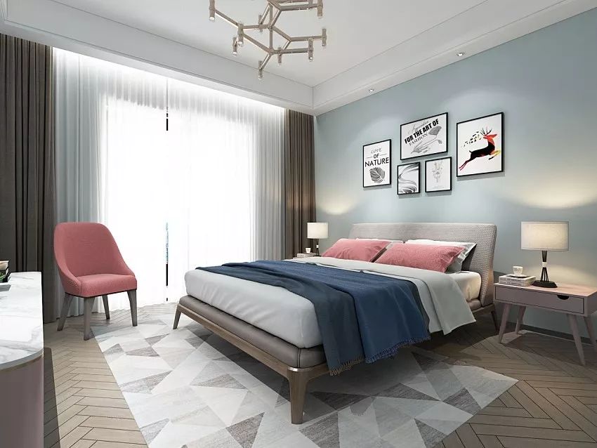 主卧室的背景墙延续了客餐厅的配色方案,还用照片墙来进行点缀,粉色的抱枕和单椅给卧室带来一丝浪漫、可爱的感觉。