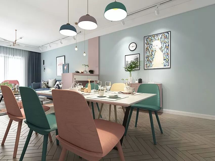 走过玄关走廊就到了餐厅空间,餐厅的墙面刷成了浅蓝色,青绿色和粉色的餐椅大理石餐桌,上方的吊灯也是相同的色调搭配方案,看起来非常有小清新感。
