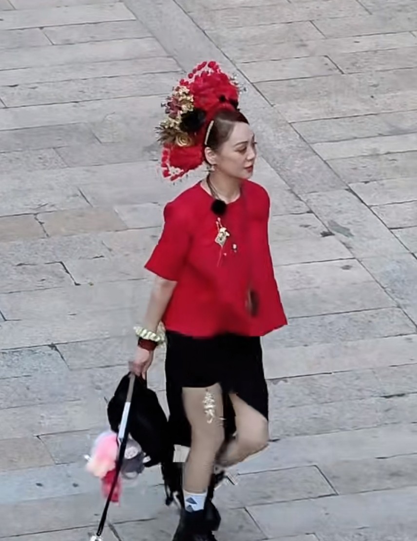 宁静这套造型明显是精心搭配过的,红色上衣配上黑色高开叉长裙,脚踩马丁靴,简单不失性感,还因为上衣与头上正红色的簪花相得益彰,看起来格外喜庆。