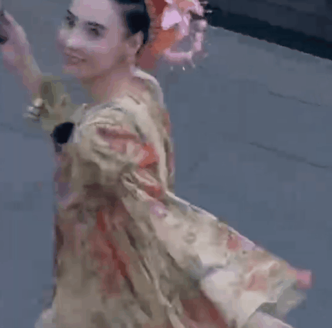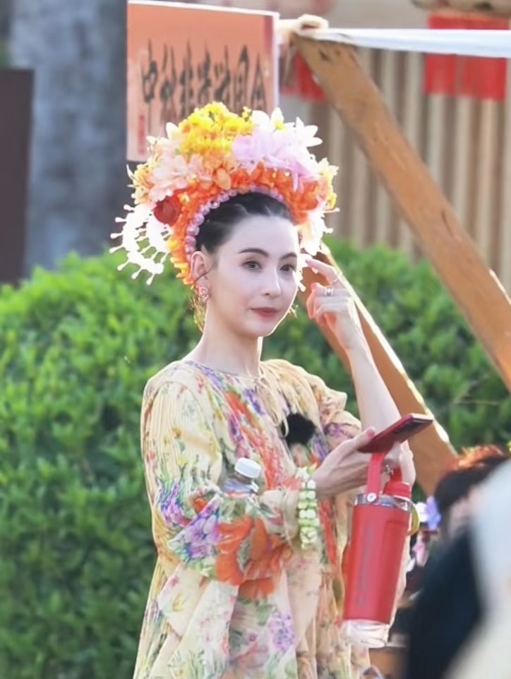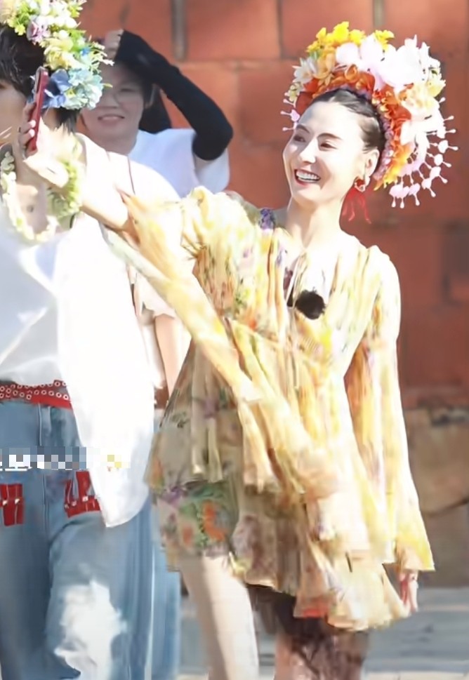 不同于其他姐姐身上都带一点红色的元素,簪花选的也是红色系,张柏芝穿着嫩黄色的碎花裙,配的簪花则是橙色系的。