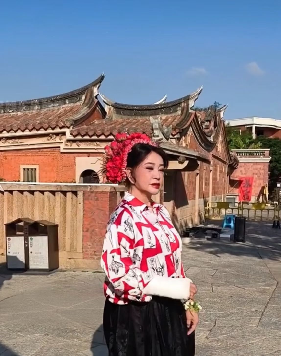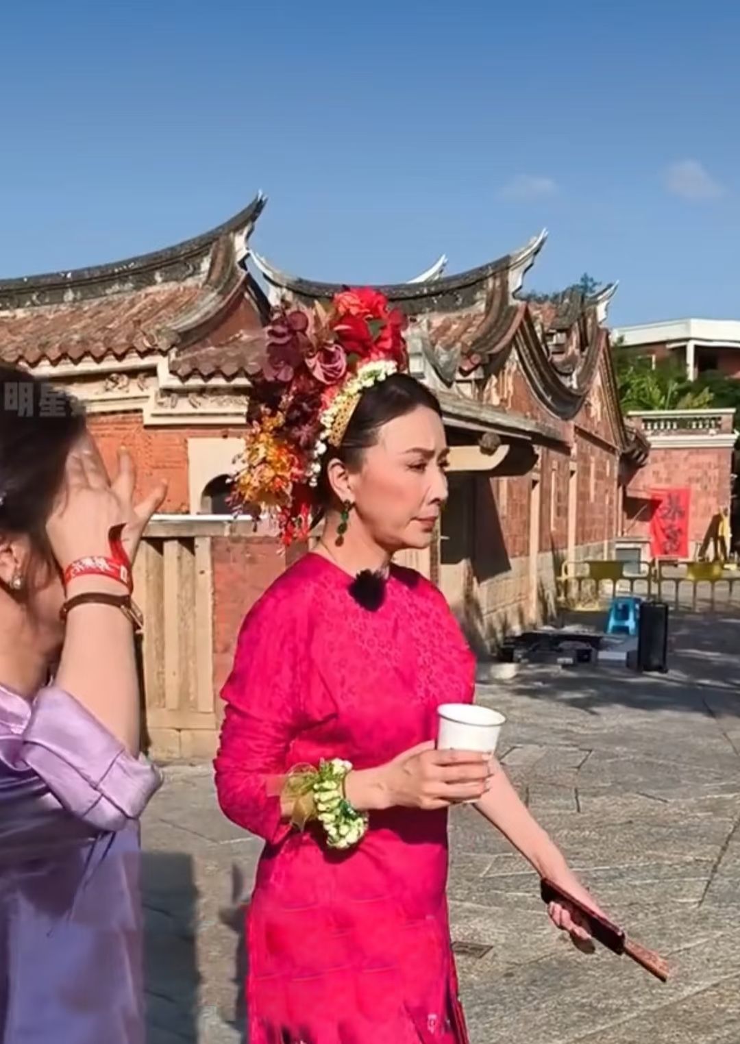 在前几期节目路透中,造型一直都很低调,穿搭色系以黑白灰为主的刘嘉玲,到了泉州却直接选了一套最艳的。