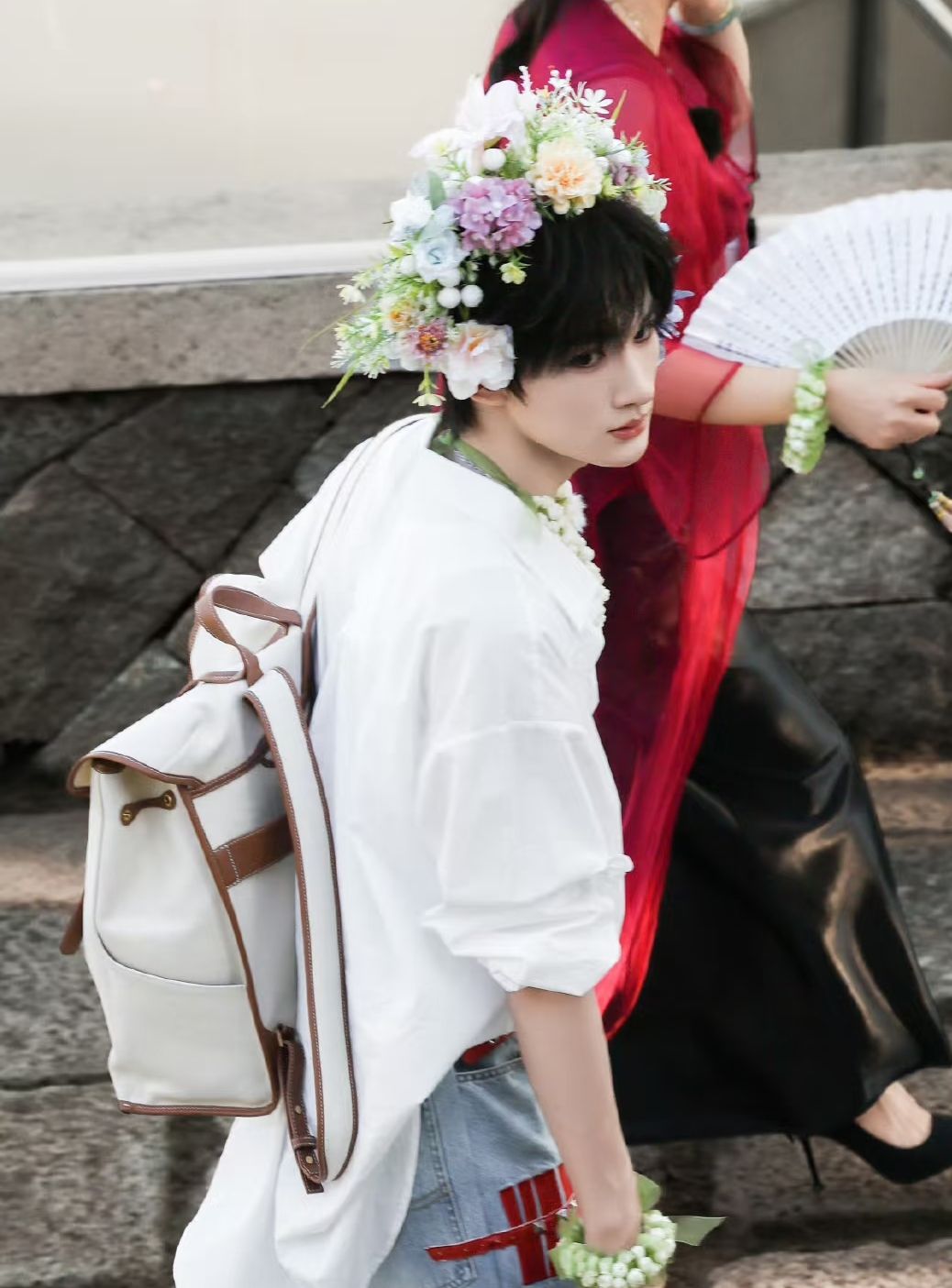 两人的簪花样式十分相似,但气质却截然不同,余宇涵标准的高冷男神,路透中迎着光站着,感觉跟拍电影差不多。