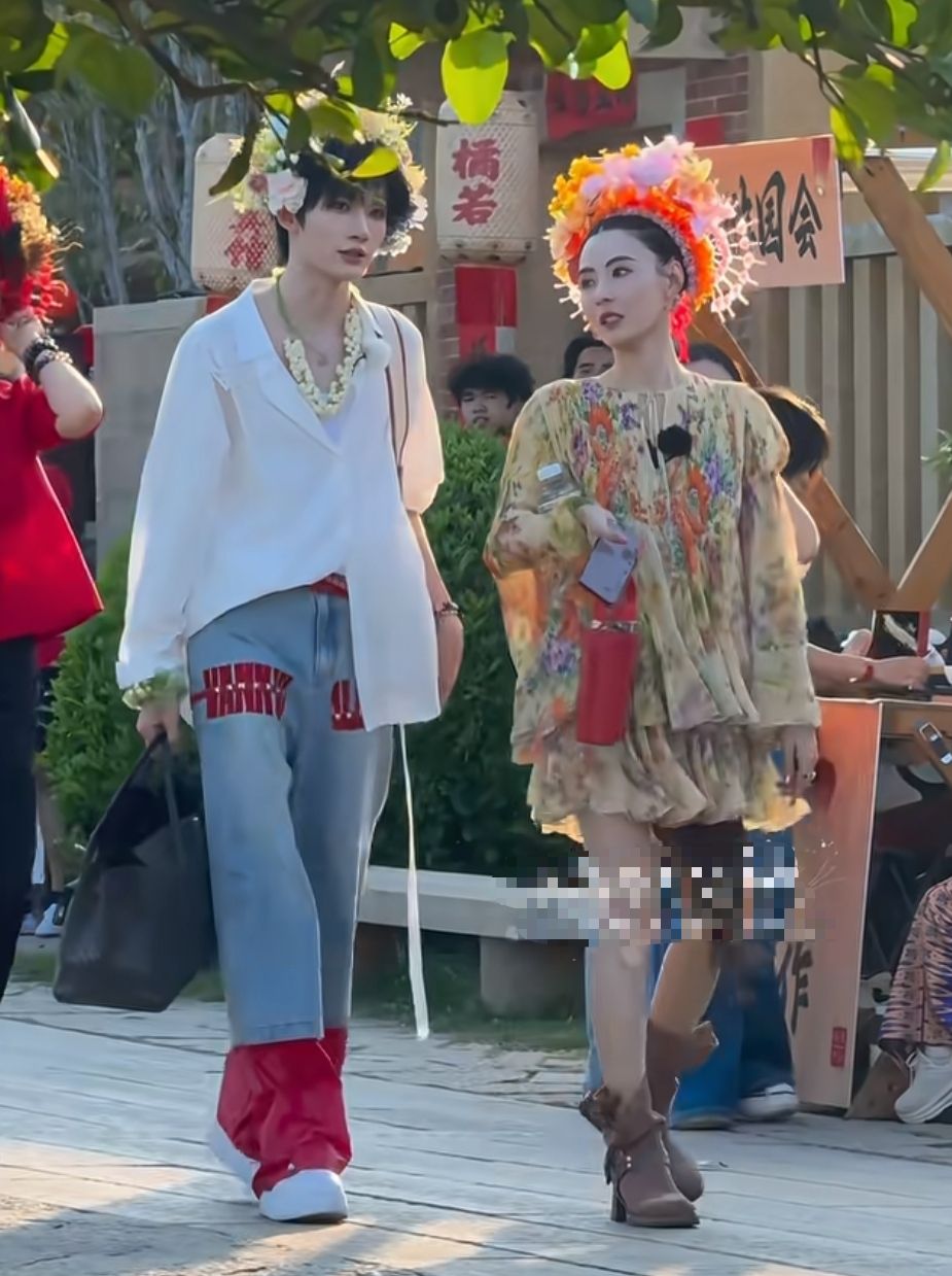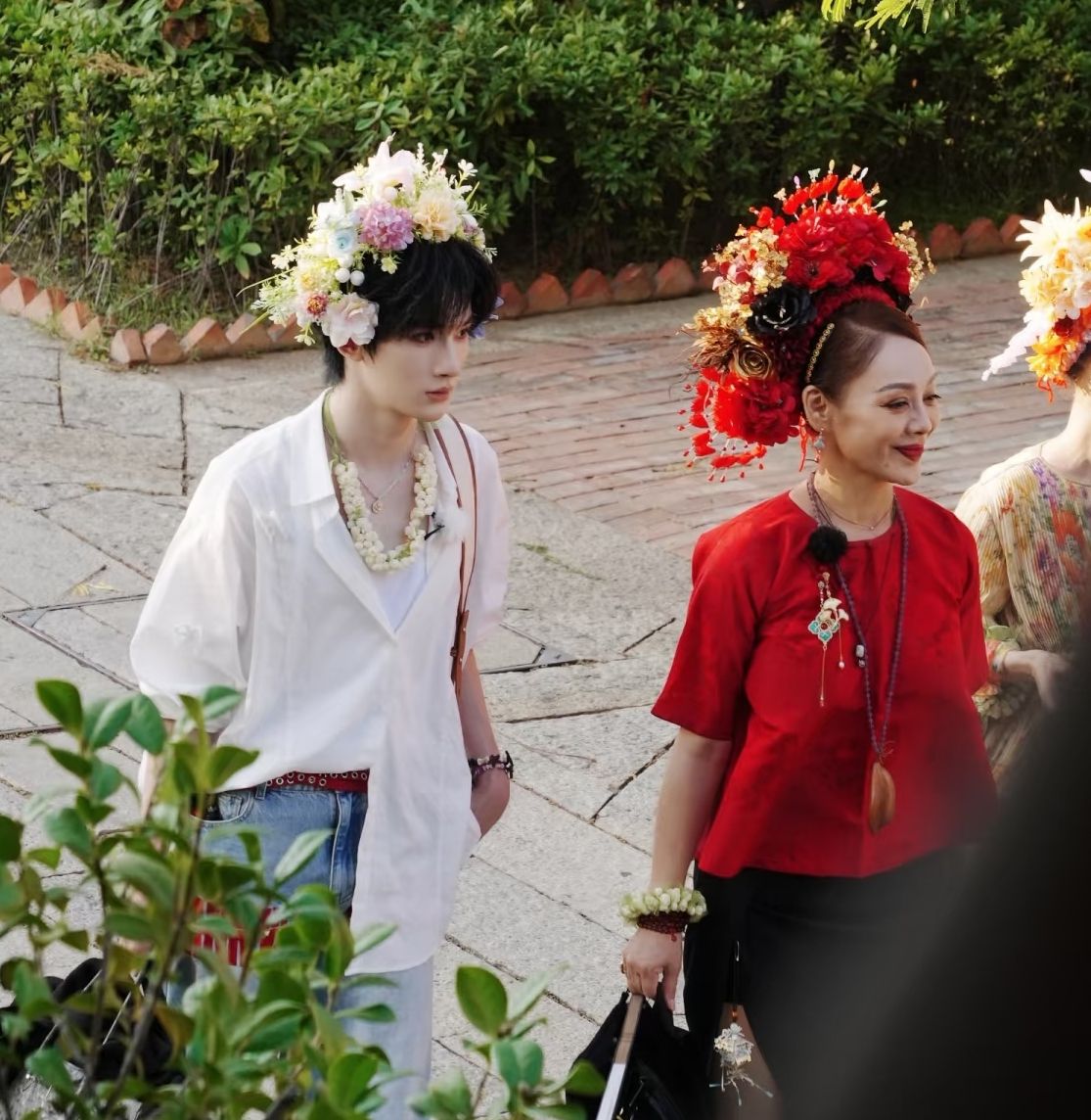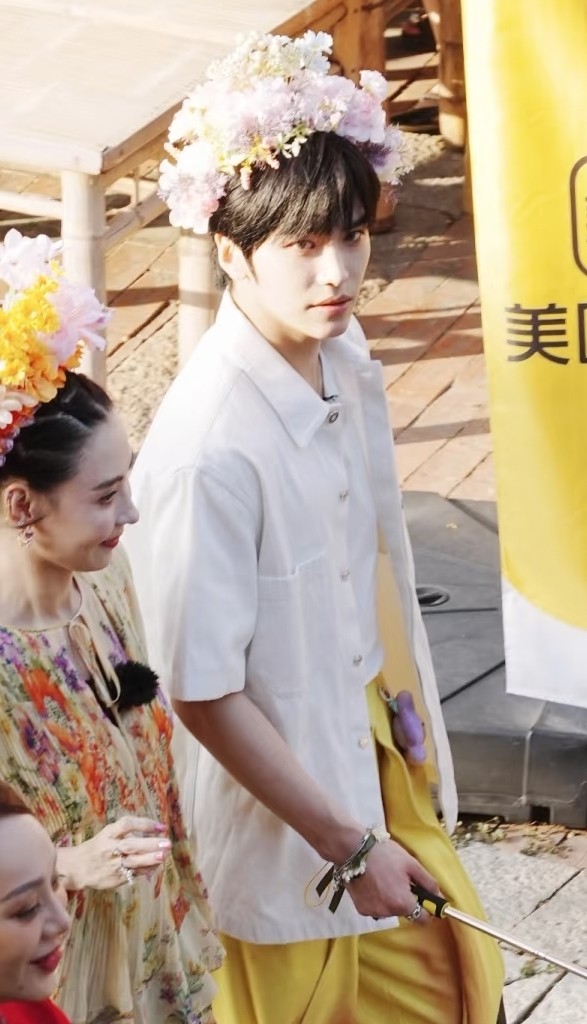 邵子恒身穿白色短袖衬衣,搭配黄色休闲裤,妆造本身就很简单,因此配上粉嫩簪花,既清爽又有小王子的即视感。