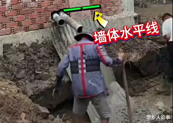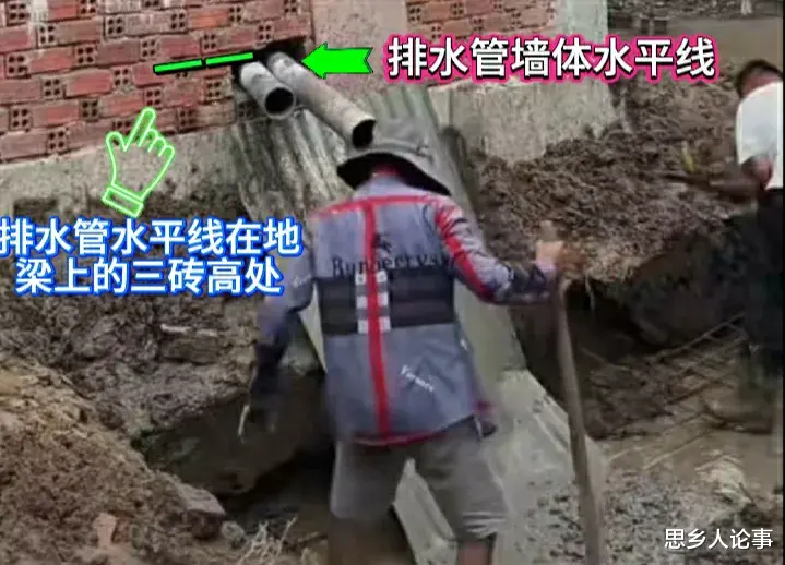 点开下面这张图就可以发现,连接房外化粪池的排进管道有两个,一个是来自卫生间的,一个是来自厨房的,都是倾斜向下流的。而人站在化粪池的底层面上,头顶刚好齐平排水管的出墙口,而排水管的墙洞刚好在地圈梁上的第2块和第3块砖处,说明化粪池盖面平齐地梁上的第4块砖时,化粪池的深度将不会低于1.7米深。