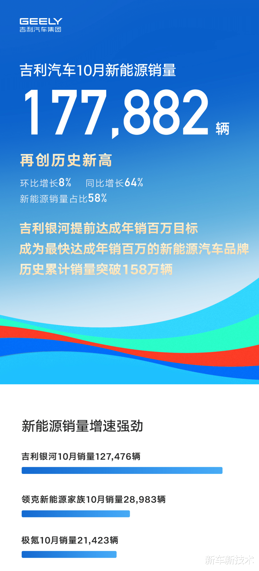 值得关注的是,在整体销量结构中,吉利汽车的新能源渗透率已达58%,1-10月累计新能源销量同比增长106%。