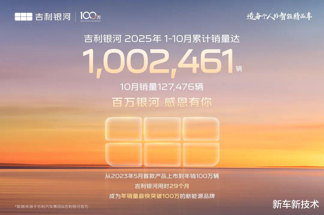 更引人注目的是,吉利汽车旗下的吉利银河提前达成"年销百万"目标,成为全球第三家、中国唯二实现这一里程碑的新能源汽车品牌。