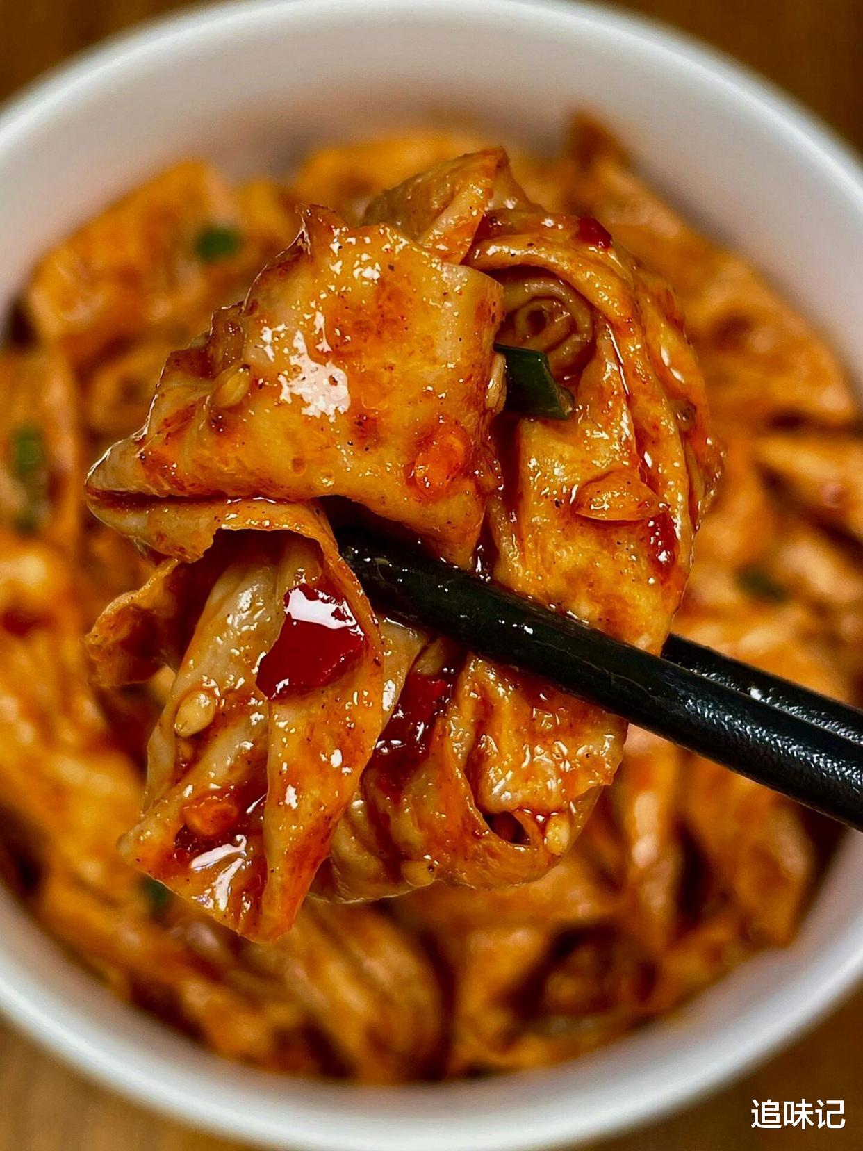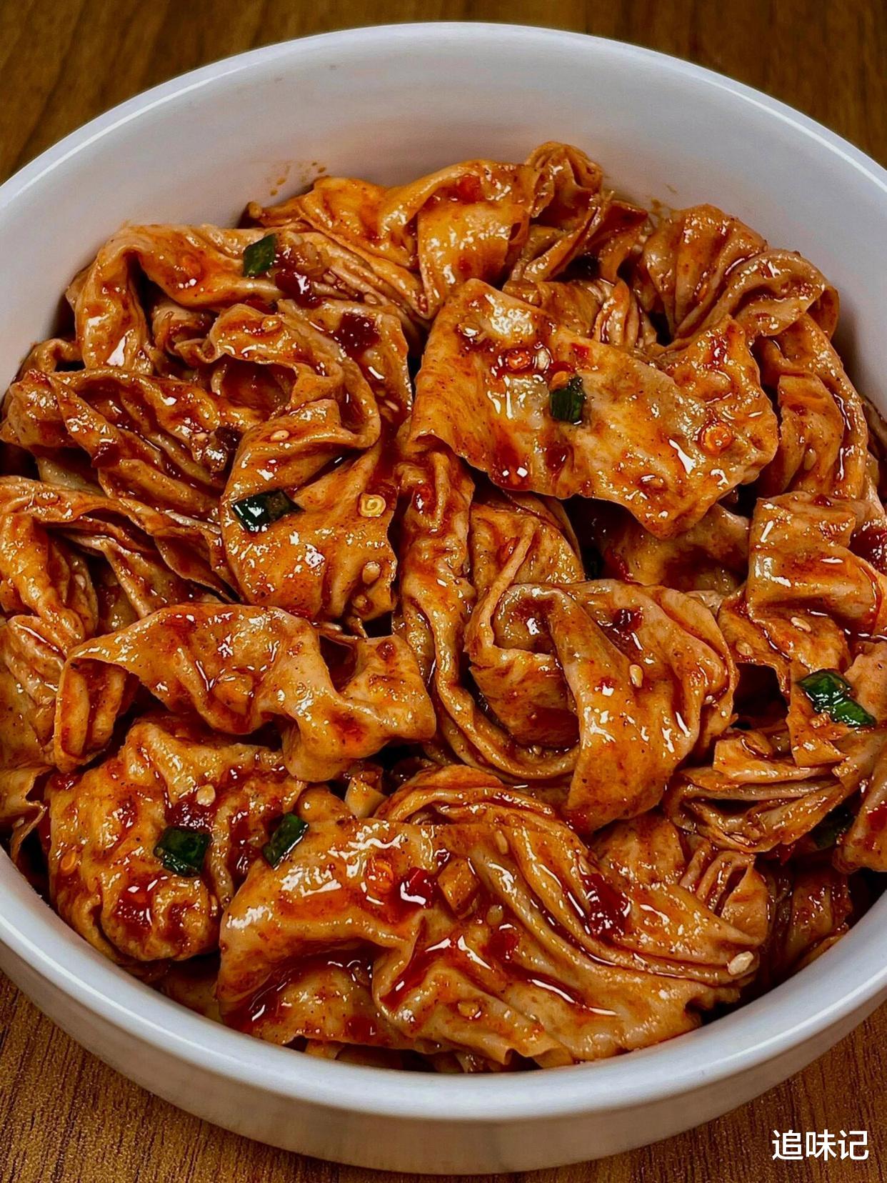 豆皮软嫩入味,孜然和辣椒的香气浓郁,酱汁浓郁醇厚,带着微微的甜味和辣味,口感层次丰富,越嚼越香。