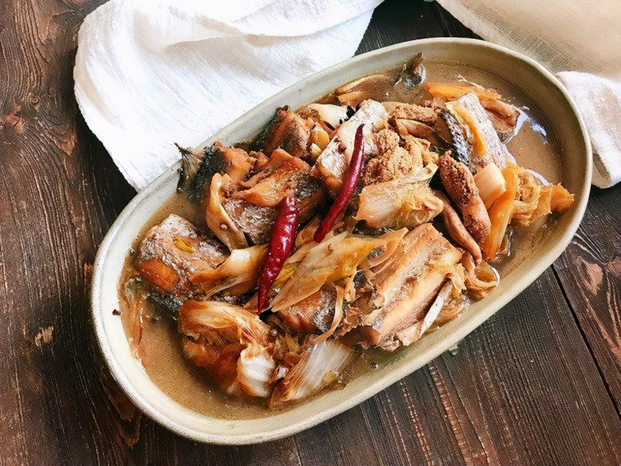3、把所有的带鱼都煎好,用锅里的余油炒白菜,把白菜炒软,摆入煎好的带鱼,放入葱姜蒜,加入花椒大料和干辣椒,