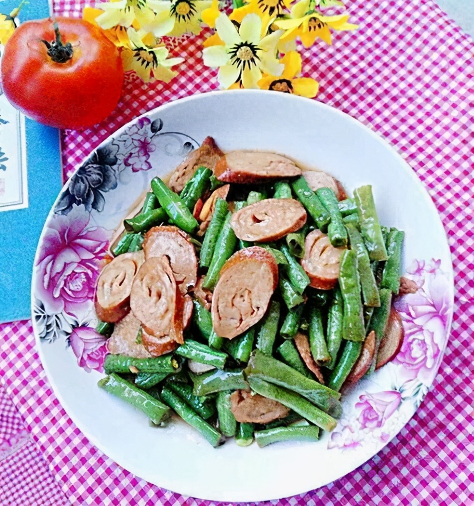1.素鸡洗净切片,豆角去老筋洗干净切小段,生姜洗干净切片,大蒜洗净切碎