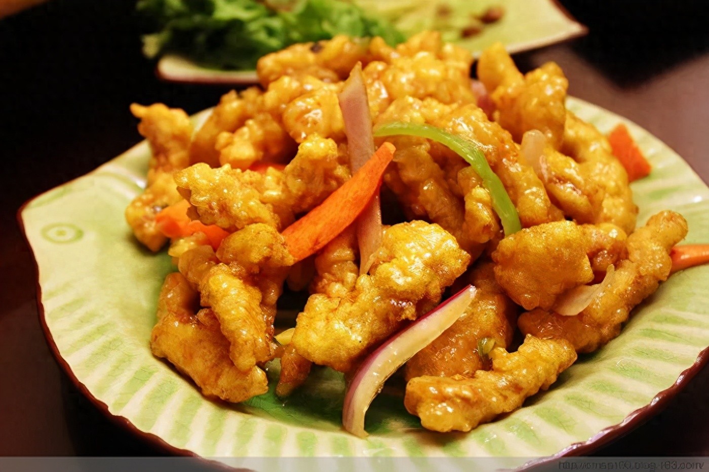 4. 中高油温170度以上,把肉条一个个的下入油锅中炸制,炸成表面微有焦色,大部分金黄。炸好的肉条控油备用。