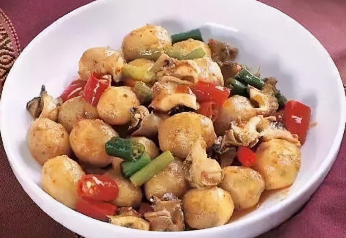 3 放入处理好的海螺肉、小土豆,改小火煨烧入味,放青、红椒节,下水淀粉,大火收汁,淋少许豆瓣油即可。