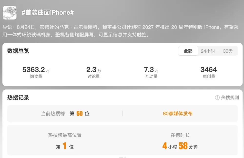 此前,#首款曲面iPhone# 这一话题就登上过热搜榜单,其中显示了 20 周年特别版 iPhone的外观设计信息。