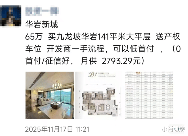 华岩新城某楼盘突然大跳水,据说“65万就能买一套141平四房大平层、还带产权车位”,征信好还能0首付,让人大跌眼镜。